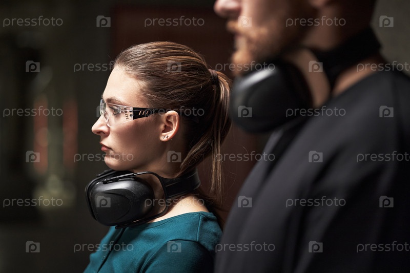Молодая женщина, носящая очки безопасности и защиту слуха в помещении