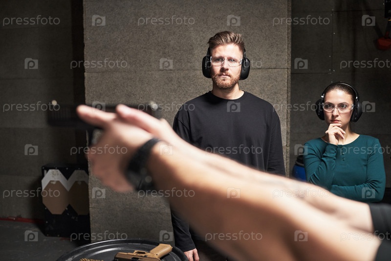 Молодой мужчина и женщина наблюдают за тренировкой по стрельбе из огнестрельного оружия на стрелковом полигоне