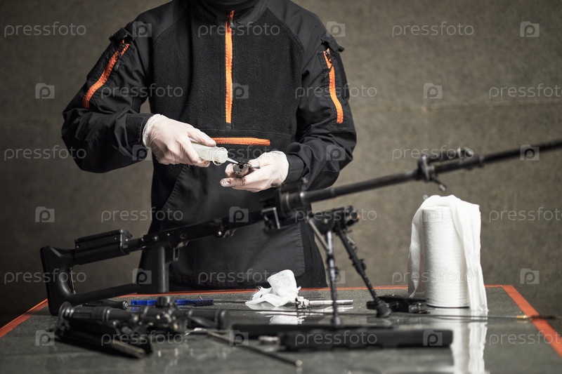 Молодой взрослый мужчина очищает винтовку с перчатками в условиях мастерской