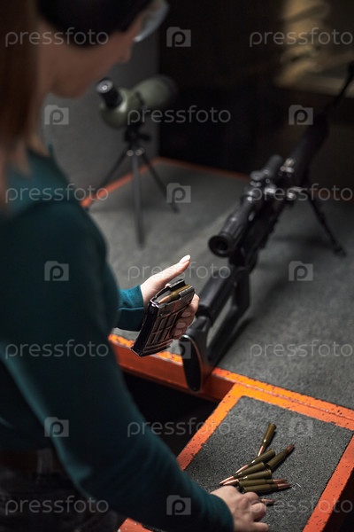 Молодая взрослая женщина загружает журнал о ружье с боеприпасами в помещении