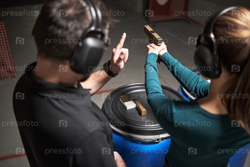 Молодая женщина практикует стрельбу из пистолета с инструктором на стрелковом полигоне