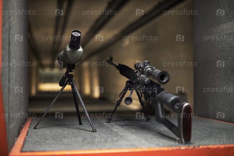 Снайперская винтовка и поля зрения расположены на скамейке стрельбы, готовясь