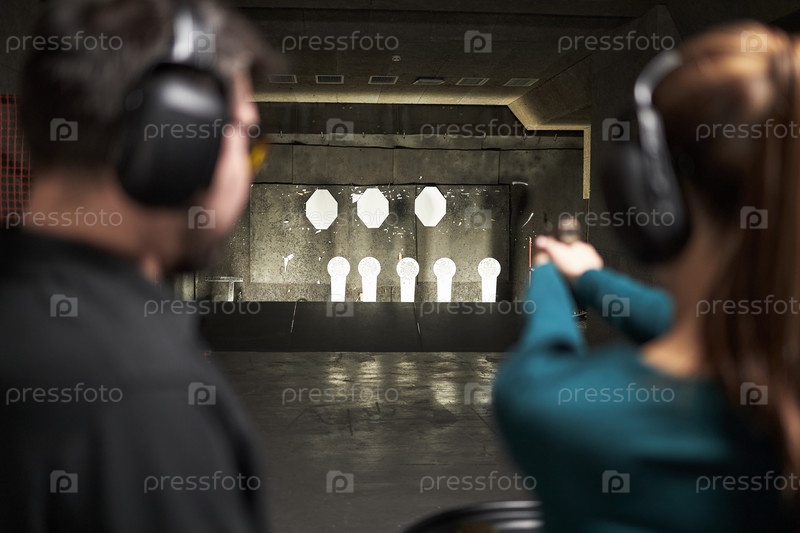 Молодая женщина практикует стрельбу на крытой даче с инструктором