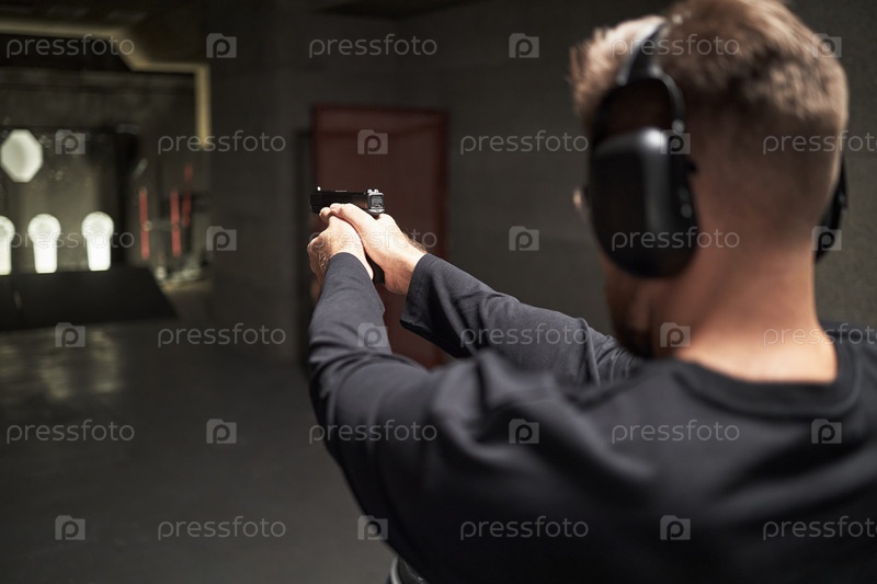 Молодой взрослый мужчина практикует стрельбу из пистолета на крытой стрелковой площадке