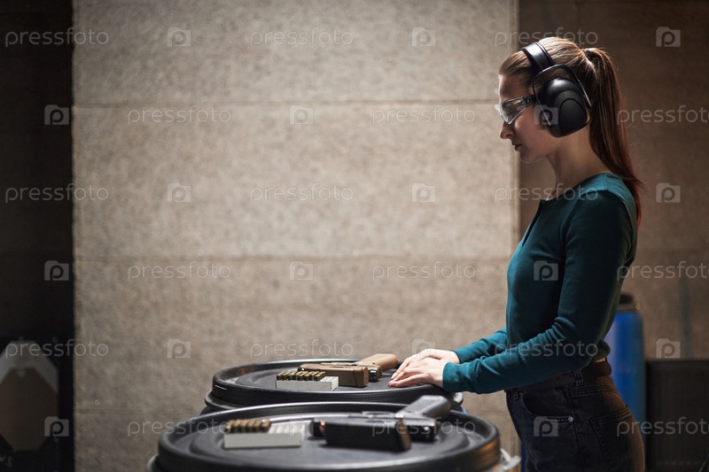 Молодая женщина готовит боеприпасы на стрельбе в помещении