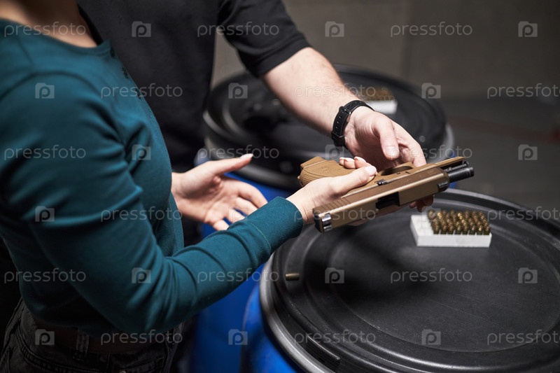 Молодая женщина получает инструкции по оружию от мужчины среднего возраста