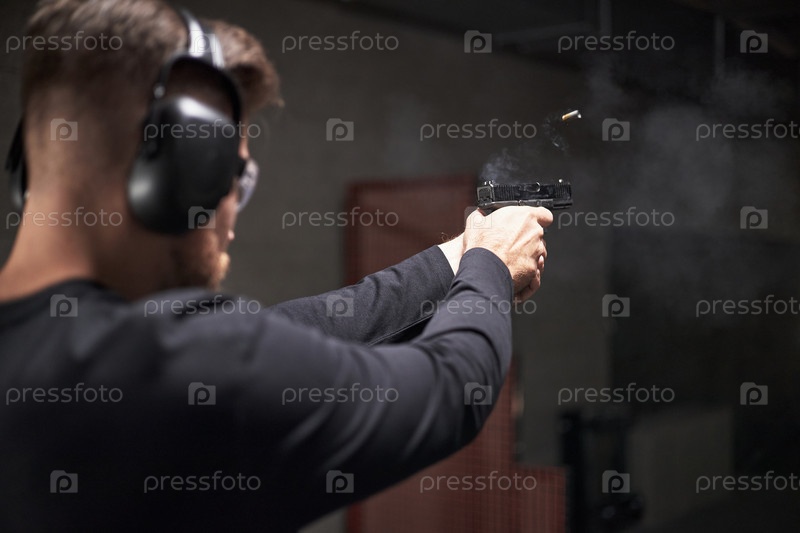 Молодой взрослый мужчина стреляет из полуавтоматического пистолета на Indoor Shooting Range