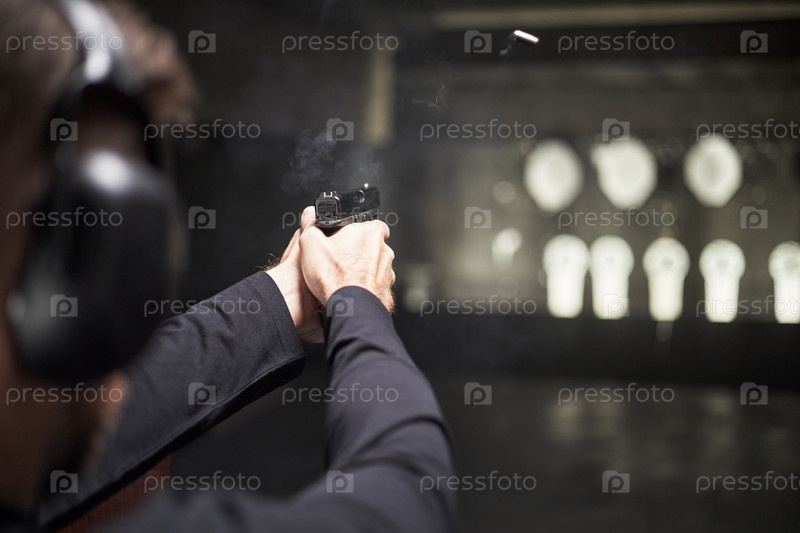 Молодой взрослый мужчина направляет пистолет на цель в помещении стрельбища