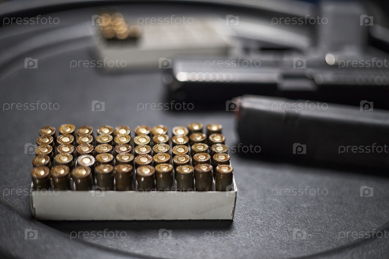 Ближайшее изображение магазина пистолета и пуль, расположенных на столе в зоне стрельбы