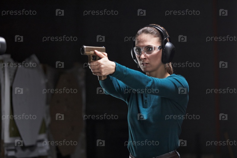 Молодая взрослая женщина, носящая защиту ушей Практикующая стрельбу из пистолета в помещении