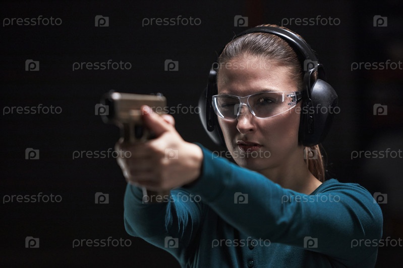 Молодая взрослая женщина практикует стрельбу на крытой стрелковой площадке