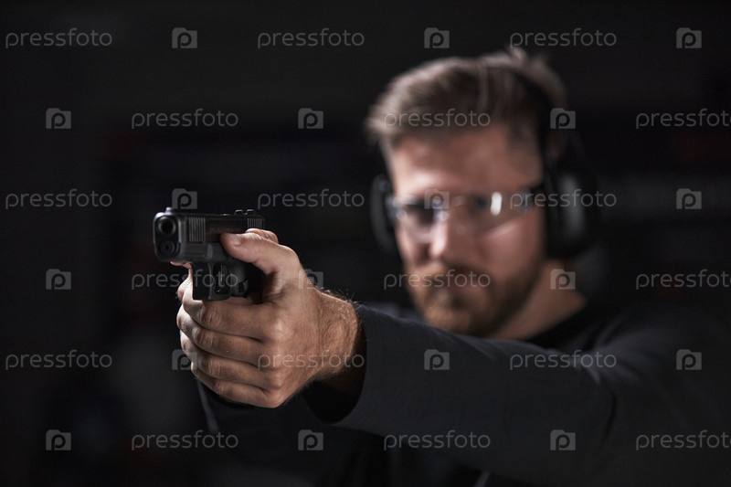 Молодой взрослый мужчина в защитном снаряжении концентрируется, стреляя из пистолета