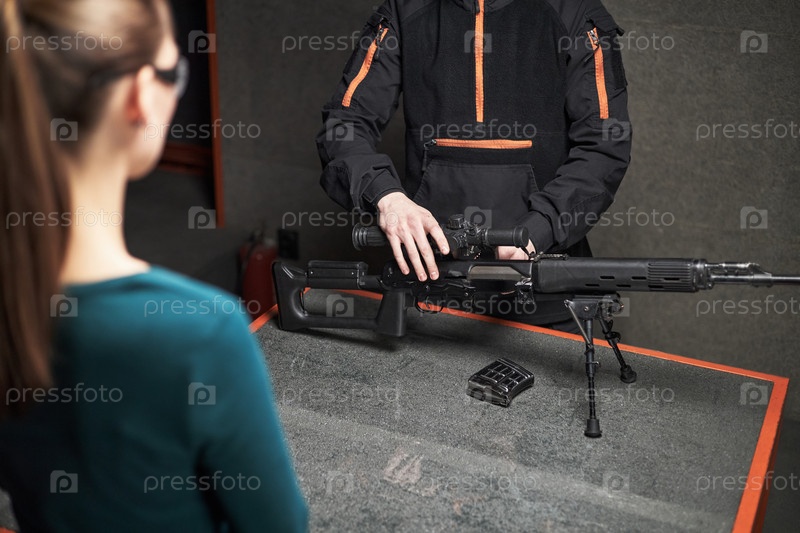 Молодая женщина наблюдает за мужчиной, собирающим винтовку в помещении