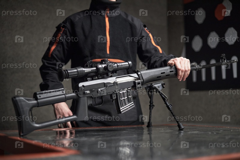 Молодой взрослый мужчина держит снайперскую винтовку на Indoor Shooting Range
