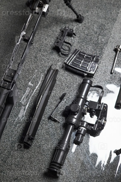 Демонтированная военная винтовка с объемом действия и журналом, лежащим на отражающей поверхности