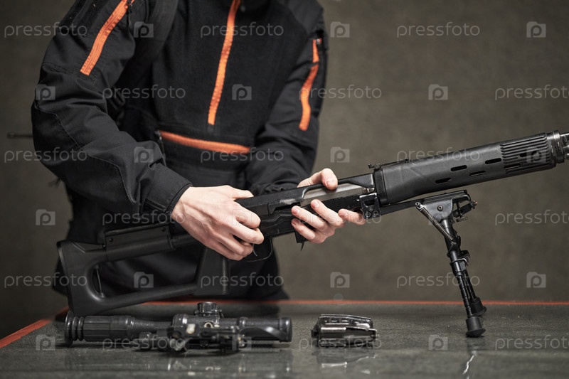 Молодой взрослый мужчина собирает штурмовую винтовку в помещении во время тренировки