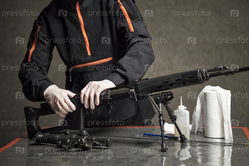 Мужчина средних лет очищает винтовку с перчатками в помещении