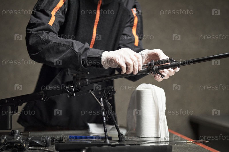 Молодой взрослый мужчина собирает винтовку, нося защитные перчатки