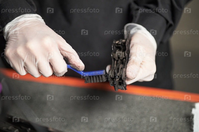 Молодой взрослый мужчина чистит цепочку велосипеда кистью в мастерской
