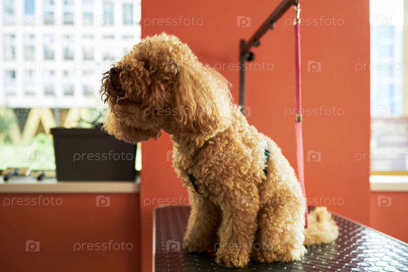 Курица с закрученными волосами сидит на столе ухода, ожидая стрижки в помещении
