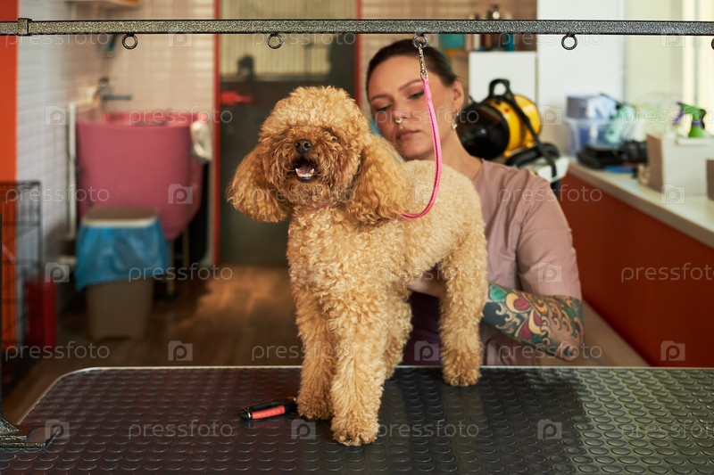 Молодая взрослая женщина ухаживает за пуделем в салоне домашних животных