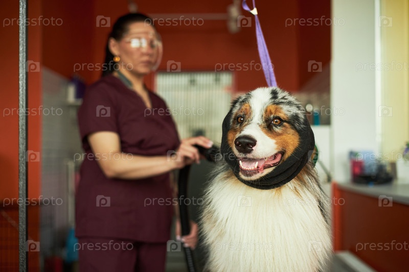 Азиатская женщина среднего возраста ухаживает за австралийской овчаркой в салоне домашних животных