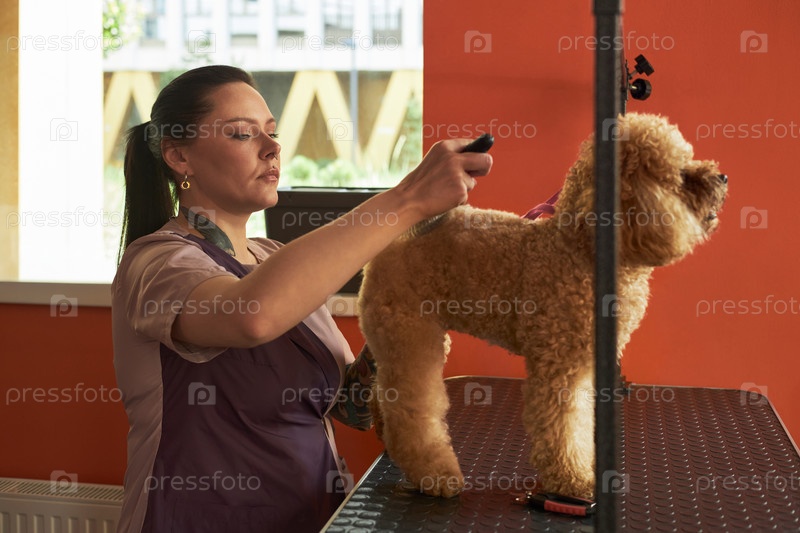 Молодой Взрослый Женщина Домашний питомец Груммер Подстрижка Кудрявый волосатый пудель Собака