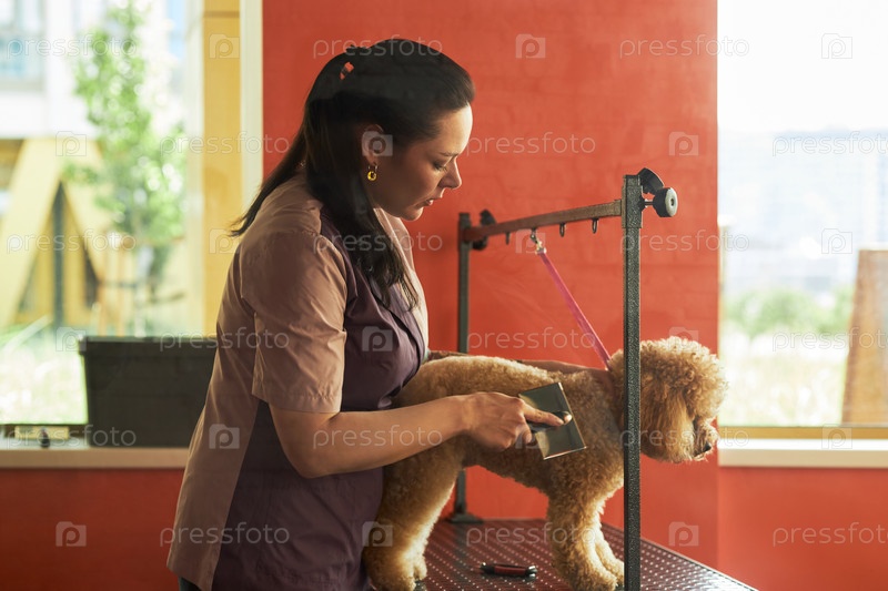 Женщина среднего возраста ухаживает за коричневой собакой в салоне домашних животных днем