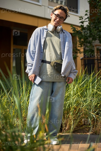 Портрет молодого взрослого мужчины, улыбающегося на улице в наушниках