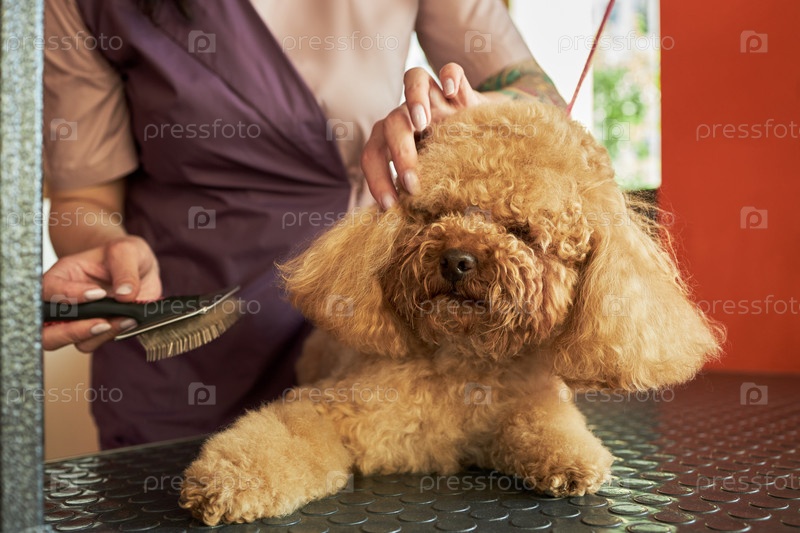 Молодая взрослая женщина ухаживает за пуделем в салоне домашних животных