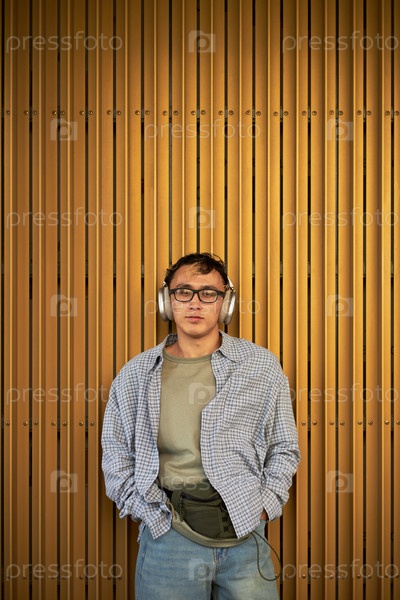 Портрет молодого взрослого мужчины, слушающего музыку с наушниками