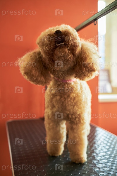 Коричневый пудель собака стоит на столе для ухода за собой лицом вверх внутри