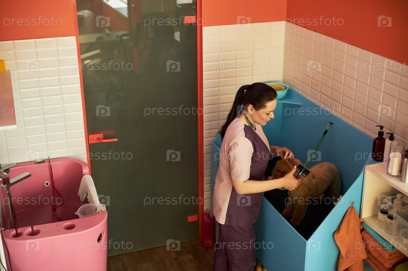 Женщина среднего возраста ухаживает за собакой в профессиональном учреждении по уходу за домашними животными