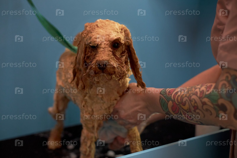 Татуированная молодая взрослая женщина моет влажную собаку во время сеанса ухода за собой