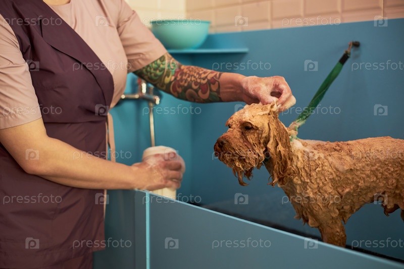 Молодая взрослая женщина моет собаку в салоне красоты с нежным уходом