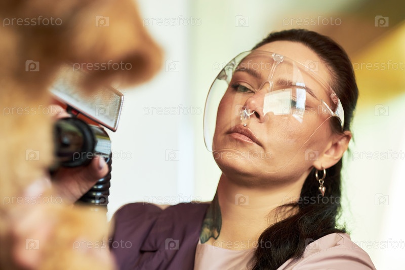 Молодая взрослая женщина ухаживает за собакой с электрическим клиппером в помещении