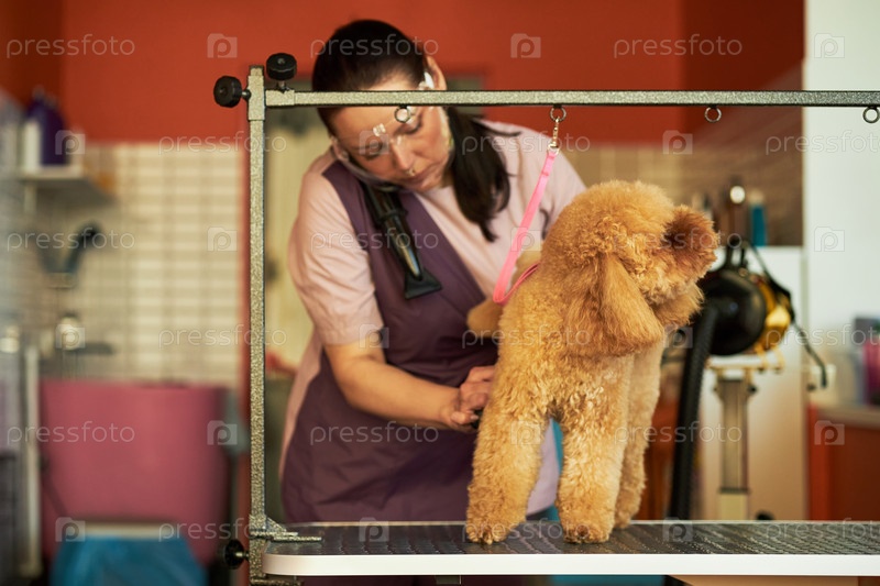 Женщина среднего возраста ухаживает за пуделем в салоне домашних животных