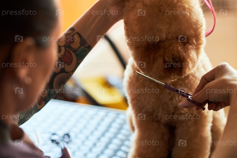 Татуированная молодая взрослая женщина ухаживает за пушистой собакой с ножницами в помещении