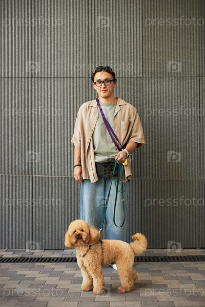 Молодой взрослый азиатский мужчина стоит на улице, держит поводок ходячий пудель