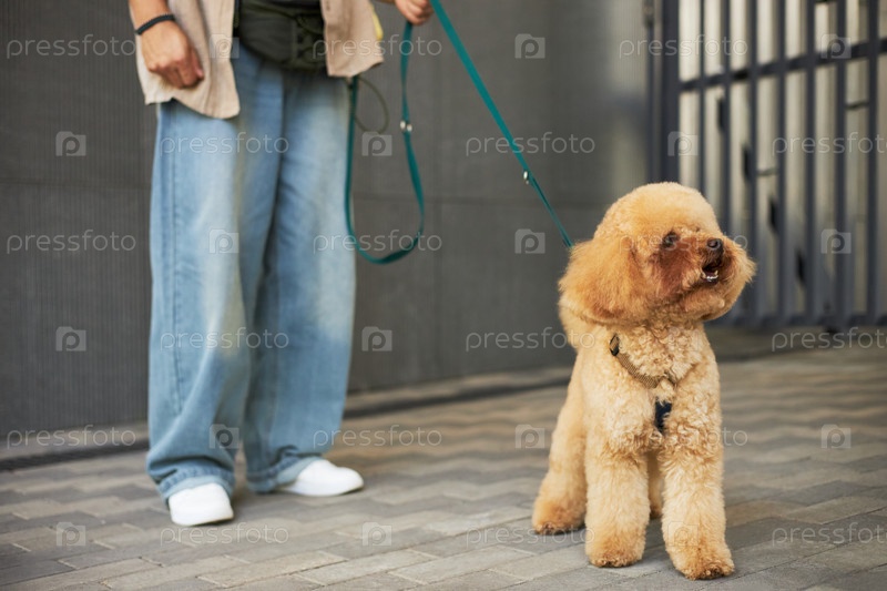 Женщина среднего возраста гуляет пуделем Собака на улице с поводком