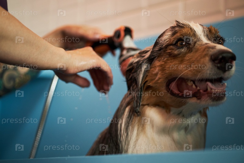 Взрослая женщина моет австралийского овчарка в салоне ухода за домашними животными
