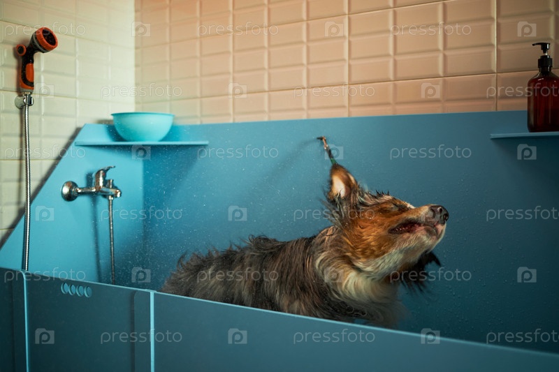 Австралийская овчарка дрожит головой во время купания в современной ванне для ухода за домашними животными