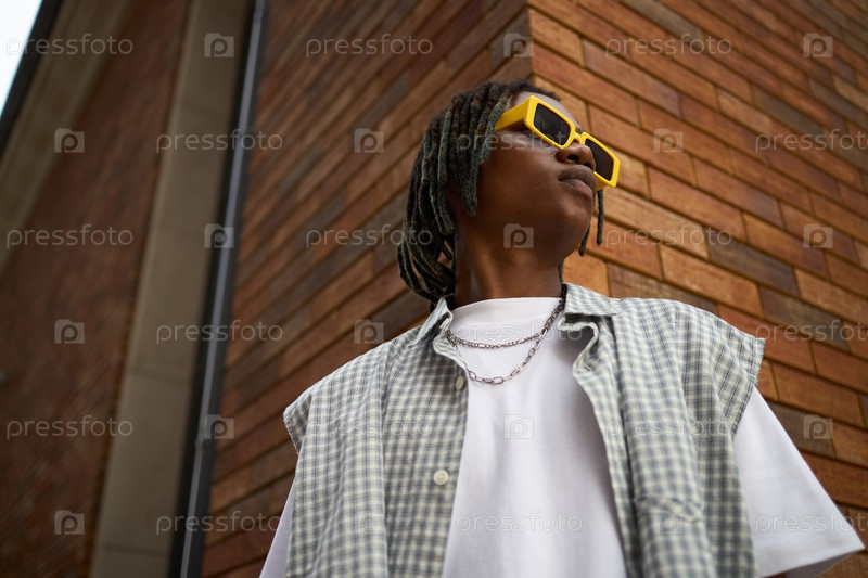 Молодой чернокожий мужчина с солнцезащитными очками стоит на улице и смотрит в сторону