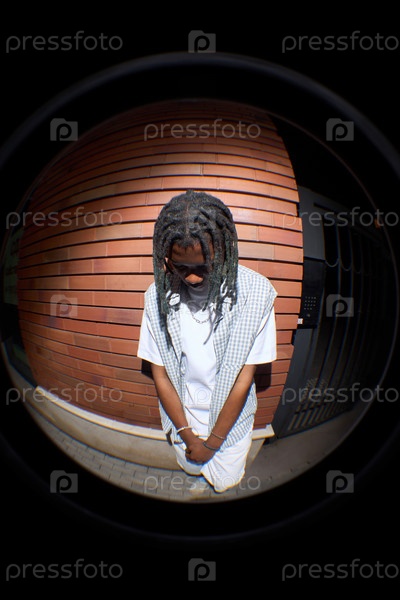 Молодой чернокожий мужчина, стоящий на улице и кланяющийся головой в городской обстановке