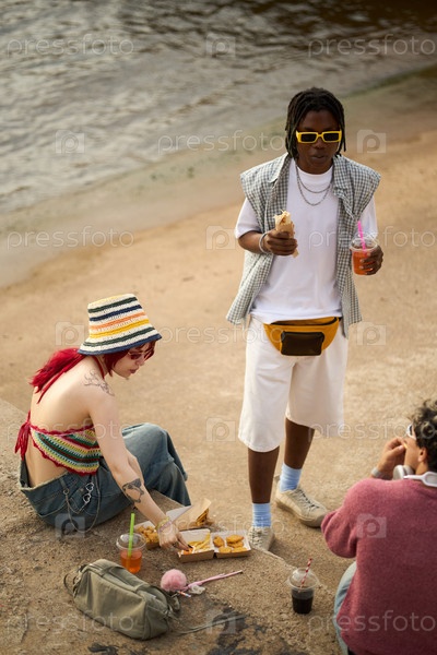 Молодая женщина и чернокожий мужчина едят фаст-фуд у Риверсайд