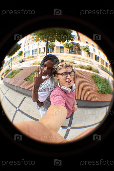 Рыбоглазный портрет двух молодых мужчин, позирующих на открытом воздухе и делающих селфи вместе