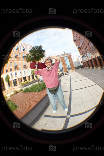 Молодой человек улыбается, держа скейтборд на открытом воздухе в городской зоне