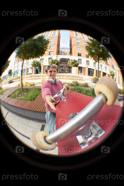 Портрет молодого человека, улыбающегося в то время как он держит скейтборд на открытом воздухе