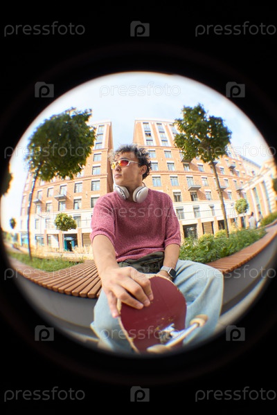 Молодой взрослый сидит на улице, держит скейтборд и смотрит в сторону
