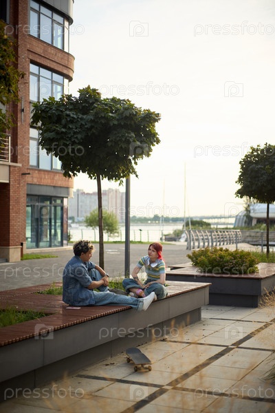 Девушка-подросток и парень разговаривают на открытом воздухе возле набережной